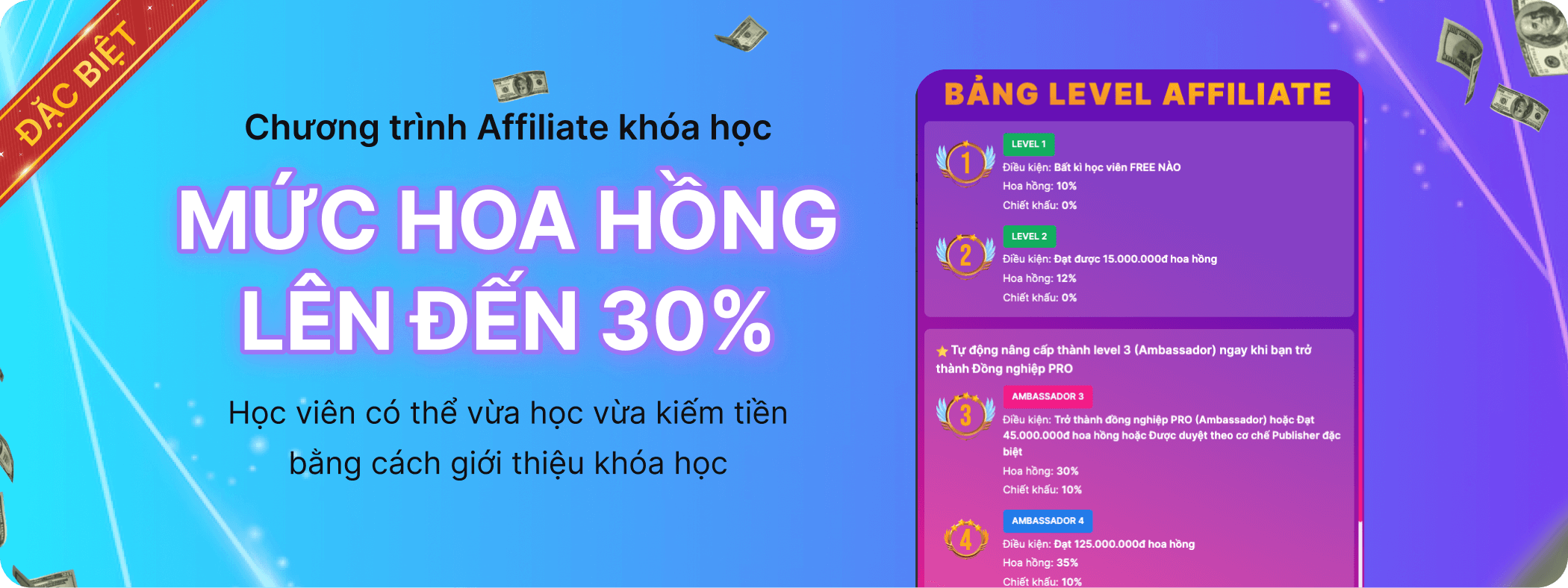Khi bạn giới thiệu khóa học cho người khác và họ đăng ký qua link riêng của bạn, bạn sẽ nhận được hoa hồng/ưu đãi học phí, hoặc quyền truy cập vào khóa học nâng cao/bonus độc quyền.